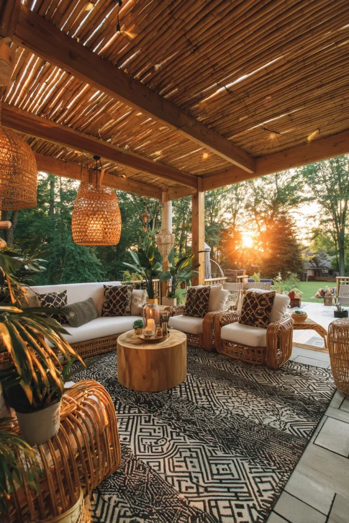 This outdoor living space is a Boho dream come true with its rich textures and natural materials. The stunning covered roof is crafted from woven bamboo or rattan, which filters the sunset light beautifully and gives off a gorgeous tropical feel. You see a cozy outdoor sofa and matching wicker armchairs dressed up with comfy cushions and fun patterned pillows. Oversized woven pendant lights hang from the ceiling, acting like little glowing sculptures and really completing that relaxed, earthy look. The geometric area rug anchors the whole space, making it feel just as intentional as any indoor room.