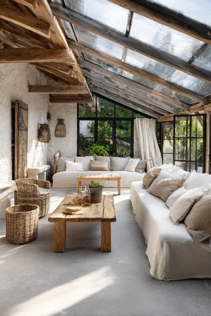 This design has a wonderfully Mediterranean-meets-farmhouse feel with its rustic charm and bright, airy atmosphere. The cover is made from clear corrugated roofing panels set on top of thick, distressed wood beams, letting in all the glorious sunshine while keeping the rain out. The walls have a lovely textured, stucco finish, and the entire space is filled with comfy, slipcovered sofas and rustic wooden furniture, giving it that perfect relaxed beach-house look. The neutral linens and woven accessories keep the focus light and breezy.