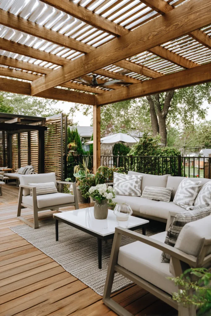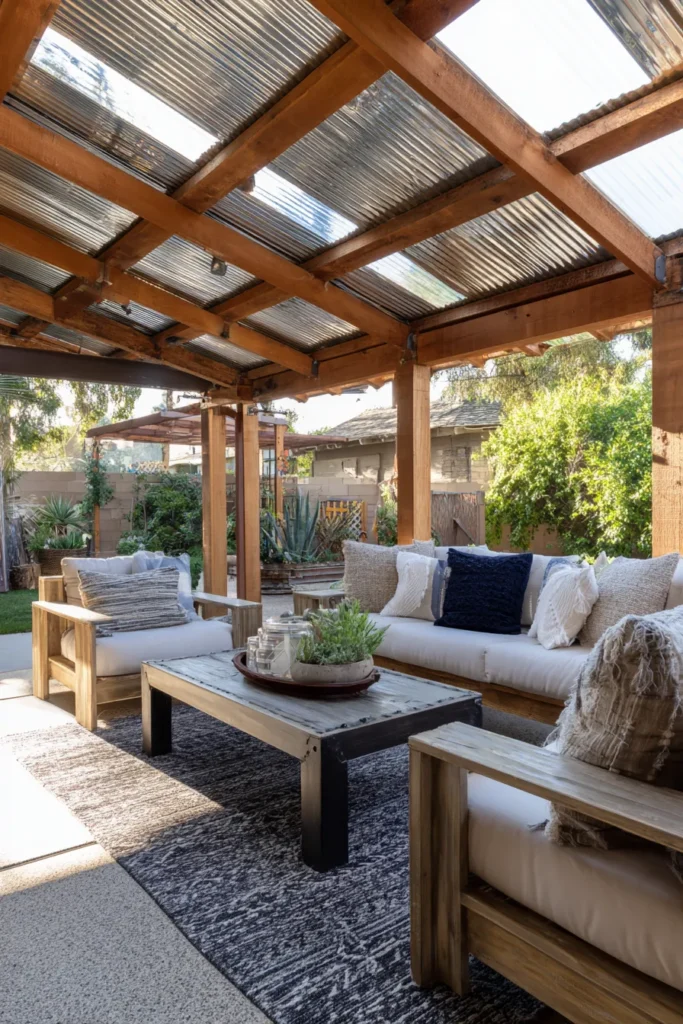 If your style leans towards Boho meets Industrial Farmhouse, this covered patio is your soulmate. The structure is built with beautiful, warm wooden beams but is topped with a corrugated metal roof that has translucent sections to let in the sunlight. This combination gives it a rugged, rustic-industrial edge while still feeling cozy. The furniture has those great chunky, wooden frames paired with super comfortable cream cushions and a mix of fun, textured throw pillows. The outdoor area rug pulls the whole casual look together with its cool patterned design.