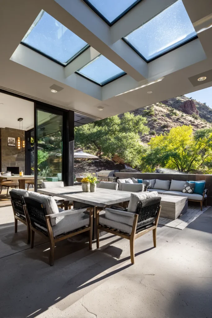 This is the ultimate in modern, architectural outdoor living, perfectly suited for a backdrop of rugged mountains or beautiful greenery. The solid covered ceiling is dramatically punctuated with large, perfectly square skylights that invite huge patches of sun and sky into the dining and lounge area. Everything here is sleek and structured, from the clean lines of the furniture to the concrete floor and the massive sliding glass door leading into the main house. The color scheme is a sophisticated mix of grays, blacks, and natural stone textures.