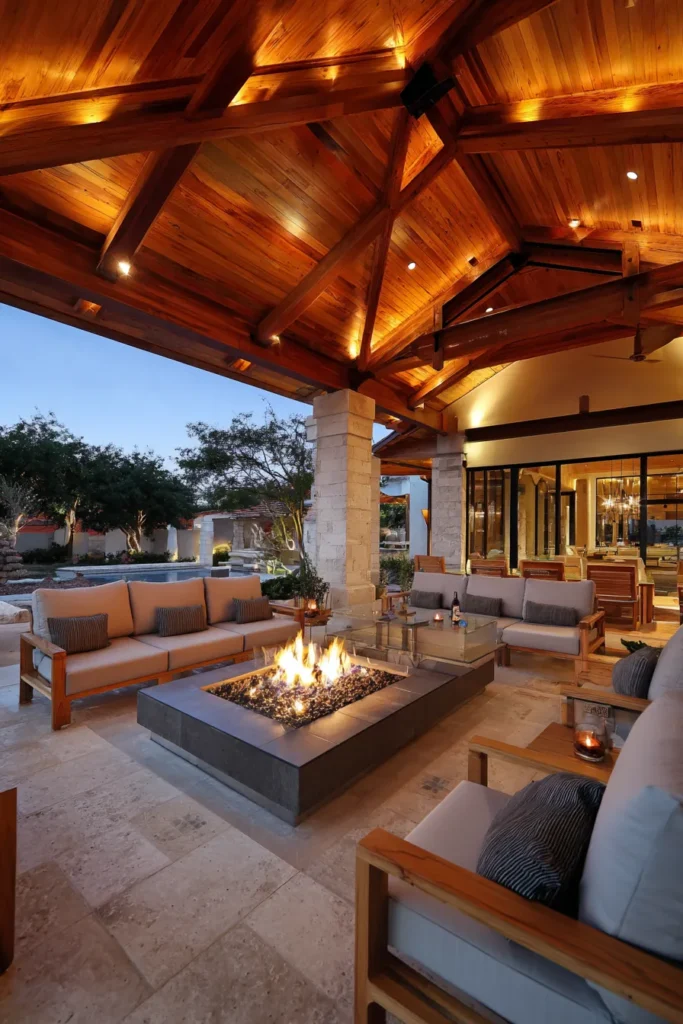 If you want a patio that feels like a five-star resort, look no further than this luxurious design. The massive covered roof features a dramatic, vaulted ceiling with heavy-duty exposed wooden beams that are stained a rich, warm tone, making the space feel incredibly grand. The flooring is a light, elegant stone tile, and the focal point is a beautiful, modern fire pit sunken into the center of the seating area. The generous space allows for multiple seating areas, making it ideal for entertaining a crowd.