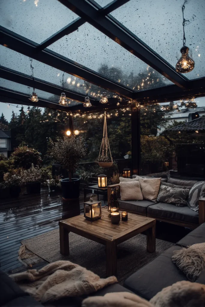 This patio proves that a clear roof isn’t just for sunny days it’s for creating an unbelievably cozy atmosphere when it’s raining. The transparent or plexiglass roof is held up by a black metal frame, providing a perfect shield from the rain while allowing you to watch the raindrops fall. The space is completely transformed by the lighting, with strands of bistro lights and rustic lanterns casting a warm, magical glow on the dark, comfortable furniture. It is the definition of a cozy hideaway on a dreary day.