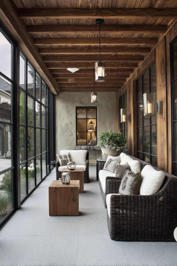 This covered space feels less like a patio and more like a glamorous glass-enclosed sunroom, giving you maximum protection and stunning views. The entire long wall is made up of black-framed windows, essentially creating a climate-controlled room that still lets you feel totally connected to the outdoors. The ceiling is lined with warm, rustic wood planks, which balances out the sleekness of the glass and the modern gray floor. The furniture is chic and comfortable, sticking to a neutral palette of deep brown wicker and soft cream cushions.