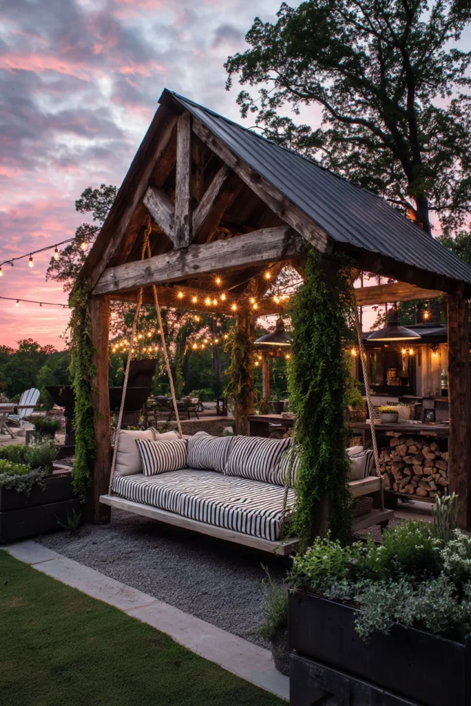 Weathered beams form a gable roof with a simple metal cover. A generous swing bed hangs from thick ropes with striped cushions that feel playful. String lights loop across the garden to tie the scene together. Planter boxes brim with herbs and trailing greens. Stacked firewood and gravel ground the space with a cabin in the garden mood.