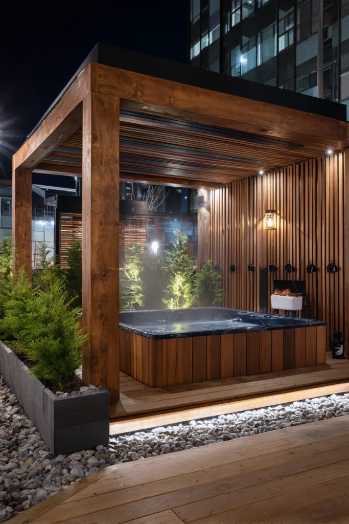 Rich cedar beams wrap a private spa nook with a slatted wall that glows softly at night. Recessed lights wash the wood and highlight the steam rising from the square hot tub. Planter boxes filled with evergreens form a green screen. Warm decking meets a line of river stones for a clean modern edge. A small wall lantern and a tidy shelf keep towels and candles close.