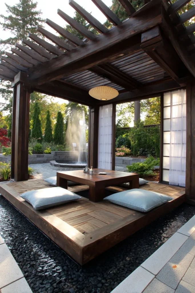 A dark timber frame creates a serene pavilion with slatted shade above. Sheer shoji style panels filter the light and the breeze. A raised wood platform holds a low square table with floor cushions in soft blue. A ribbon of black pebbles frames the deck and a nearby fountain adds a gentle hush. The palette is calm and grounded.