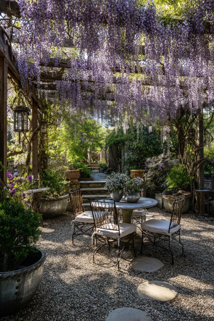 Cascades of lilac wisteria drape from heavy beams and turn the path into a floral tunnel. Vintage lanterns hang among the vines and cast romantic shadows. A petite stone table with wrought iron chairs sits on pea gravel with stepping stones leading the way. Oversized pots brim with green and blooms for a secret garden feel.