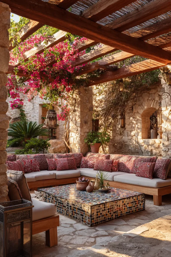Sun warmed stone walls hug a pergola topped with reed shade. Bougainvillea spills hot pink flowers over chunky wood beams. A roomy corner sofa in natural cushions wraps a low mosaic table that sparkles in the sun. Brass lanterns and terracotta pots layer in texture. The floor is rough stone that feels timeless.