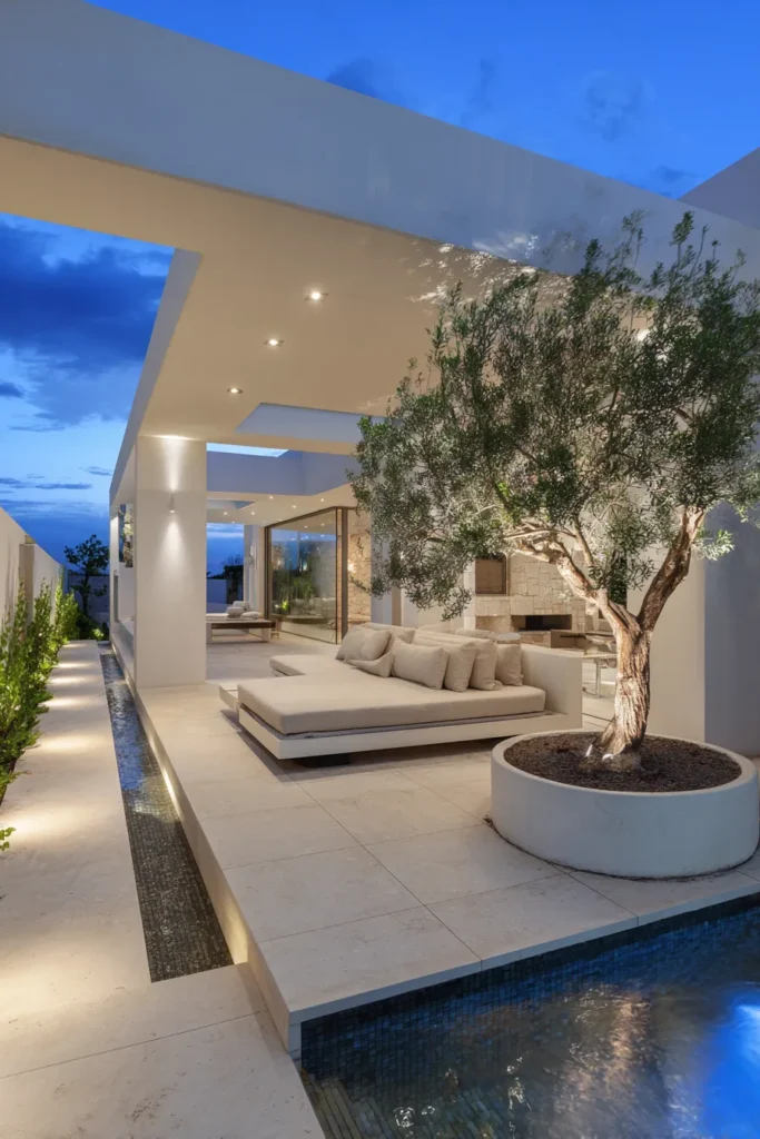 Clean planes of white concrete form a dramatic cover with cutouts for sky peeks. An extra wide daybed with sand toned cushions anchors the terrace. A slim water rill runs along the edge and mirrors the evening light. Uplighting grazes an olive tree in a round planter and low hedges line the path. Everything is sleek and serene.