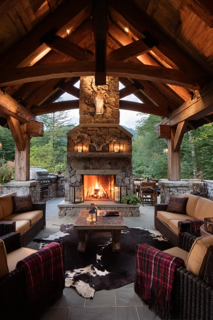 Massive wood trusses frame a vaulted cover over a roaring stone hearth. Wicker sofas with caramel cushions face each other across a rustic coffee table. Plaid throws and a cowhide rug cozy up the slate floor. A built in grill and long dining table sit nearby so cooking and lounging flow together. The forest backdrop completes the lodge mood.