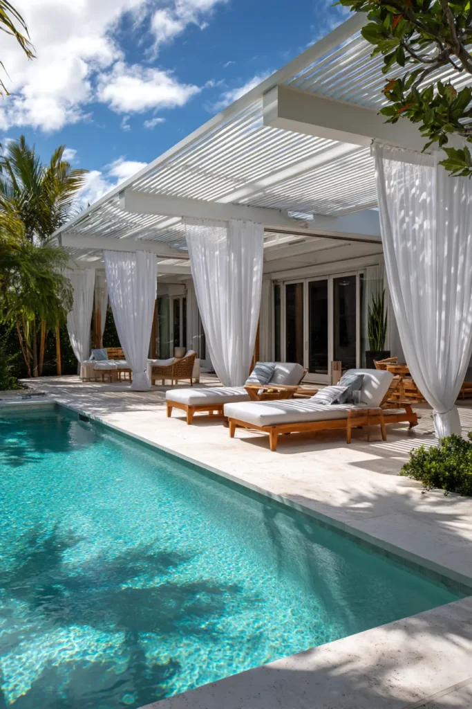 A white louvered top sends striped shadows across creamy stone pavers. Sheer white curtains pool softly at the sides and can slide shut for privacy. Teak loungers with pale cushions line the turquoise pool. A small seating group waits under the shade for smoothies and books. The look is airy and fresh.