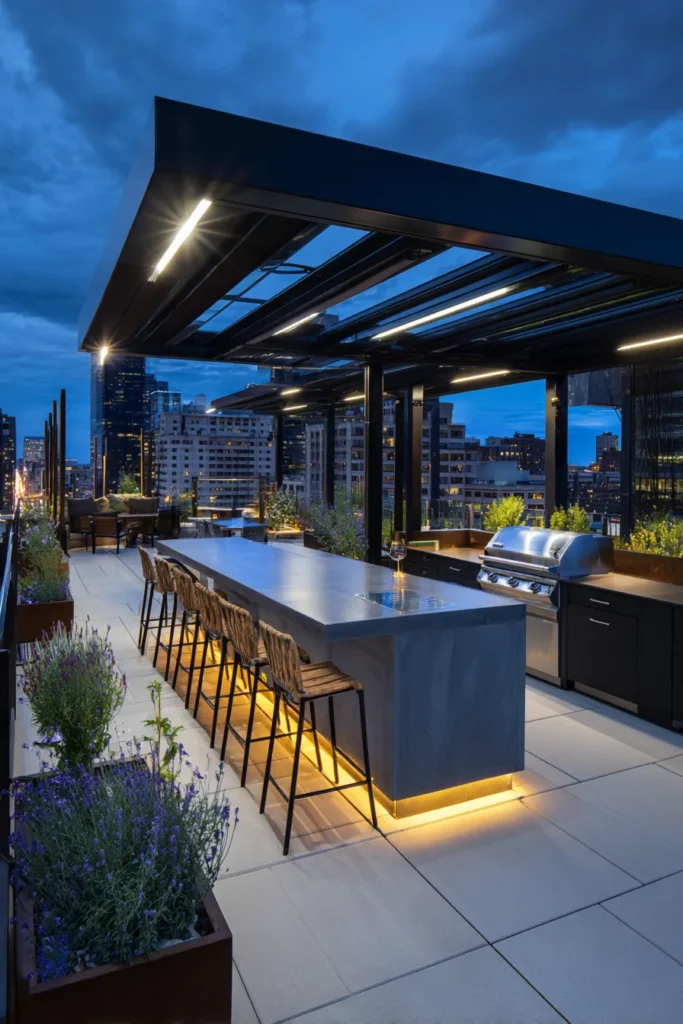 A sleek metal frame runs the length of the terrace with linear lights tucked into the beams. A concrete island stretches out with bar stools and hidden glow at the base. The grill zone and storage keep everything tidy for hosting. Slim planters with lavender and herbs soften the edges and bring scent to the breeze. The skyline becomes the artwork.