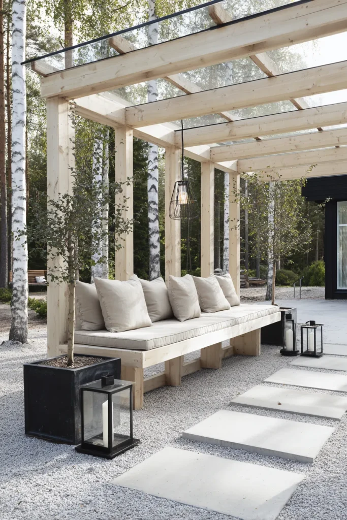 Pale timber posts support clear panels that protect from drizzle while keeping the forest view. A simple built in bench with thick sand cushions runs the length of the pergola. Black lanterns and a caged pendant bring soft light. Square planters with young trees add height and the gravel ground keeps it clean and quiet.