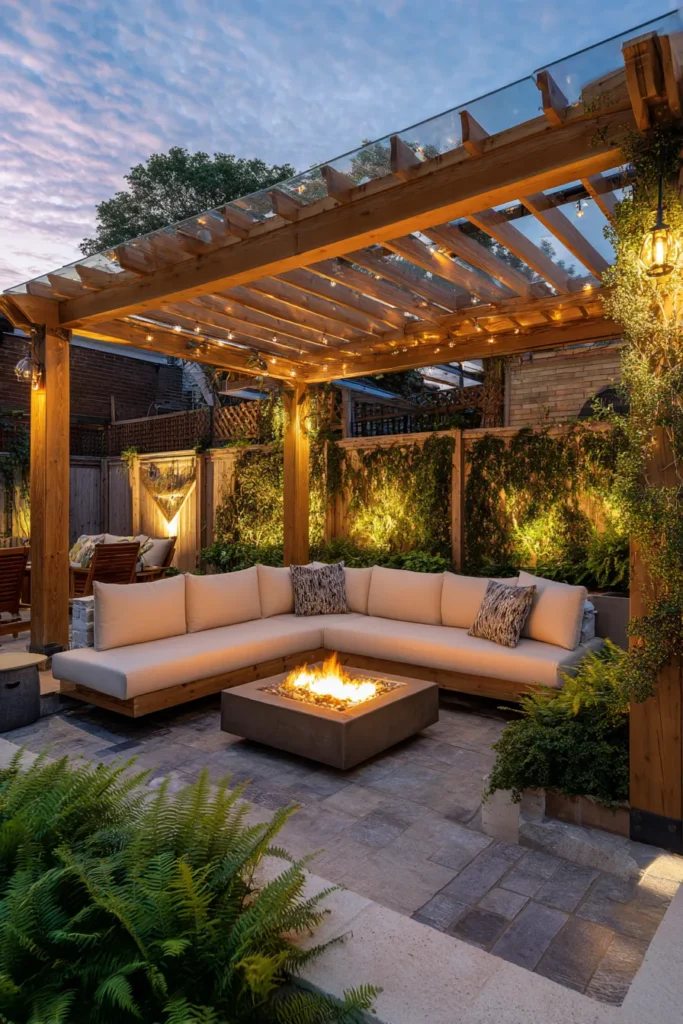 A sturdy cedar pergola frames this backyard nook with clear panels overhead that keep the sparkle of the sky while blocking drips. Twinkle lights trace the beams and lanterns glow at the posts. An L shaped cream sectional hugs a square fire pit on smooth pavers. Privacy fencing is softened with climbing vines and backlit greenery. Ferns and planters add lush edges that feel calm and tucked away.