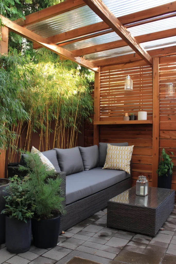 Warm cedar creates a snug corner with a clear corrugated roof for reliable shade and light. Slatted screens double as a shelf wall for lanterns and little pots. A slim sofa in charcoal sits on pavers with a compact table in front. Tall bamboo plants rustle along the fence for a lush backdrop.