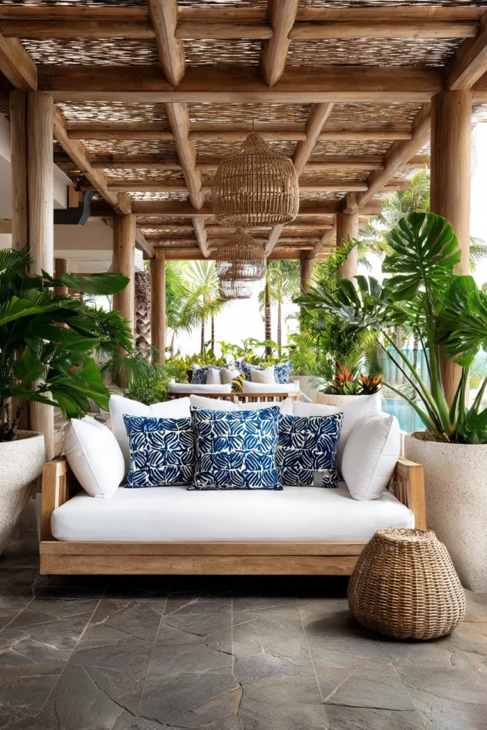 Rounded timber posts support a woven reed cover that filters the sun with pretty lattice shadows. Rattan pendants hang in a row for warm glow. A chunky teak daybed sits front and center with crisp white cushions and indigo palm print pillows. Lush planters brim with monstera and palms. Slate look pavers ground the space and frame a peek of the pool beyond.