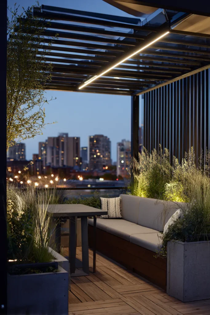 A slim black frame holds slatted shade that tucks in a sleek LED line for soft night light. A built in bench with stone tone cushions wraps a petite dining table. Planter boxes overflow with grasses and herbs that sway in the evening breeze. Wood tiles warm the floor and the skyline becomes the backdrop. Everything feels tailored and tidy.