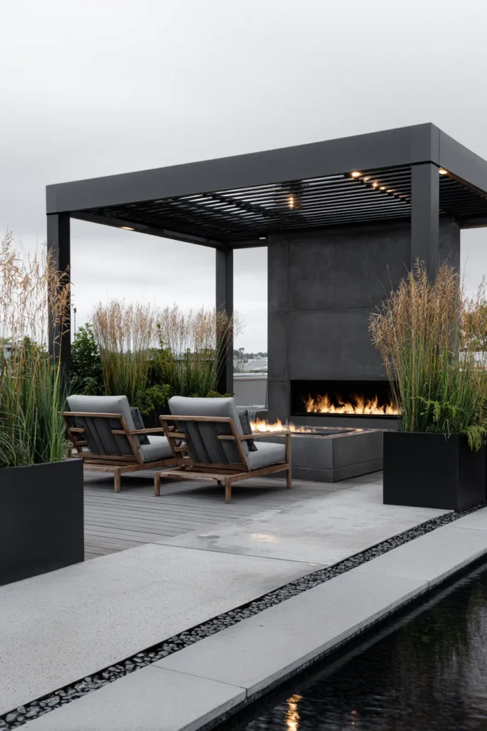 This design pairs a graphite metal frame with slim slats above for filtered light. A concrete fireplace wall stretches wide with a low modern fire feature in front. Deep lounge chairs with gray cushions sit on a smooth deck. Tall grasses in box planters give movement and privacy near the water line. The palette stays cool and sophisticated with clean lines everywhere.