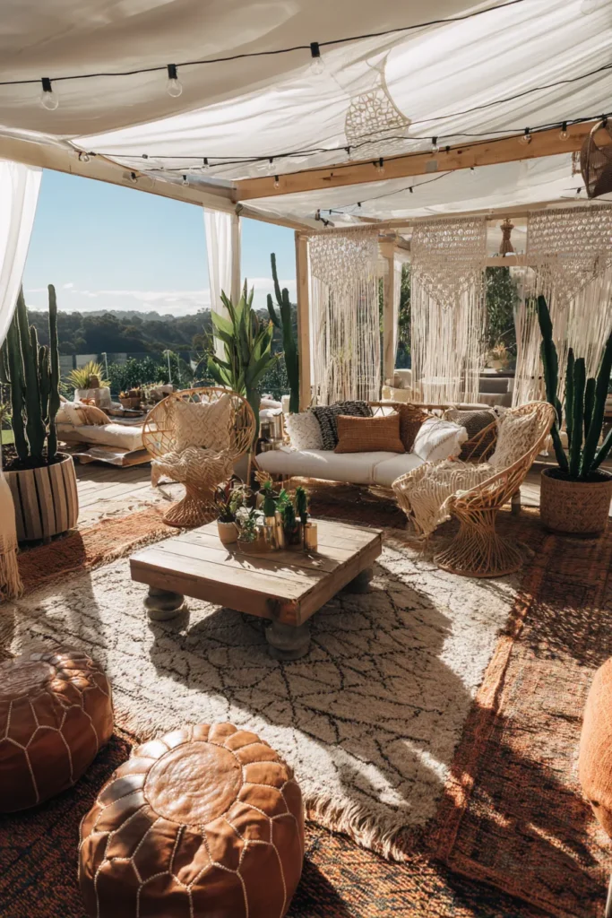 Billowy white fabric floats across the top and sides creating a dreamy canopy. Macrame panels add texture and soften the sun. Rattan chairs and a cushy loveseat circle a chunky wood coffee table. Layered rugs and leather poufs warm the floor. Potted cactus and greenery fill every corner for an easy desert meets beach mood.