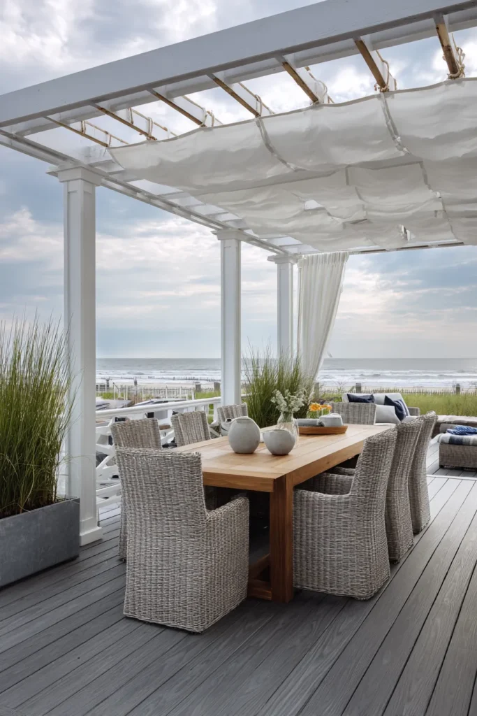 A crisp white pergola holds a relaxed fabric shade that gathers into pretty billows. Breezy curtains slide to one side to frame the ocean view. Woven dining chairs wrap a simple teak table on gray decking. Slim planters with grasses sway in the salt air and tie the space to the dunes beyond. Everything feels fresh and sun washed.