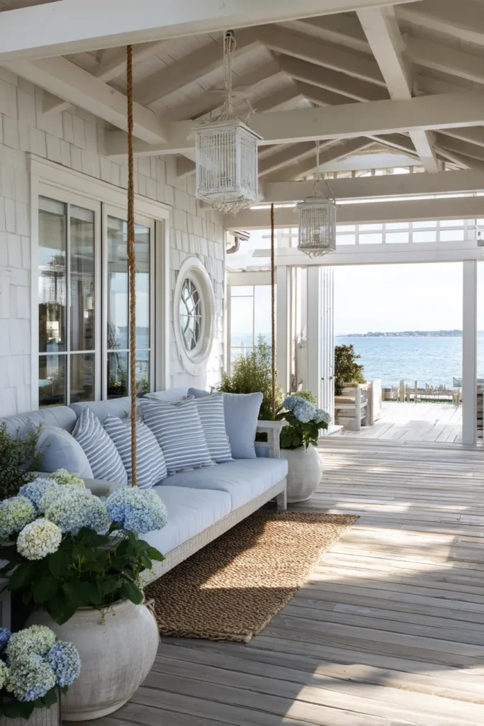 Beams painted soft white create a cottage porch feel with a pitched cover above. A rope hung daybed floats along the wall in powder blue cushions and stripes. Birdcage lanterns dangle from the rafters. Hydrangeas in oversized pots flank a natural jute rug on pale wood decking. The water view peeks through nearby openings.