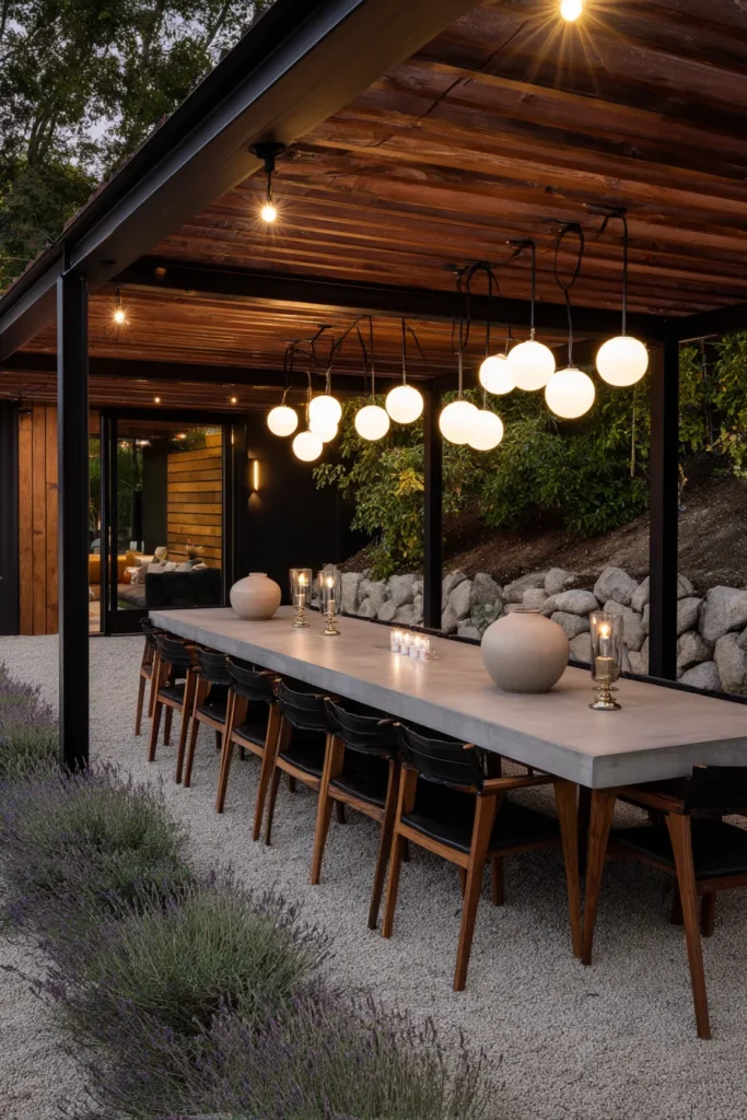 A streamlined frame holds a warm wood ceiling that glows at dusk. Pendant globes gather above a long concrete table like pearls on a string. Black chairs line both sides and gravel crunches underfoot. Lavender borders and trees wrap the scene. The palette is rich and dramatic with just enough sparkle.