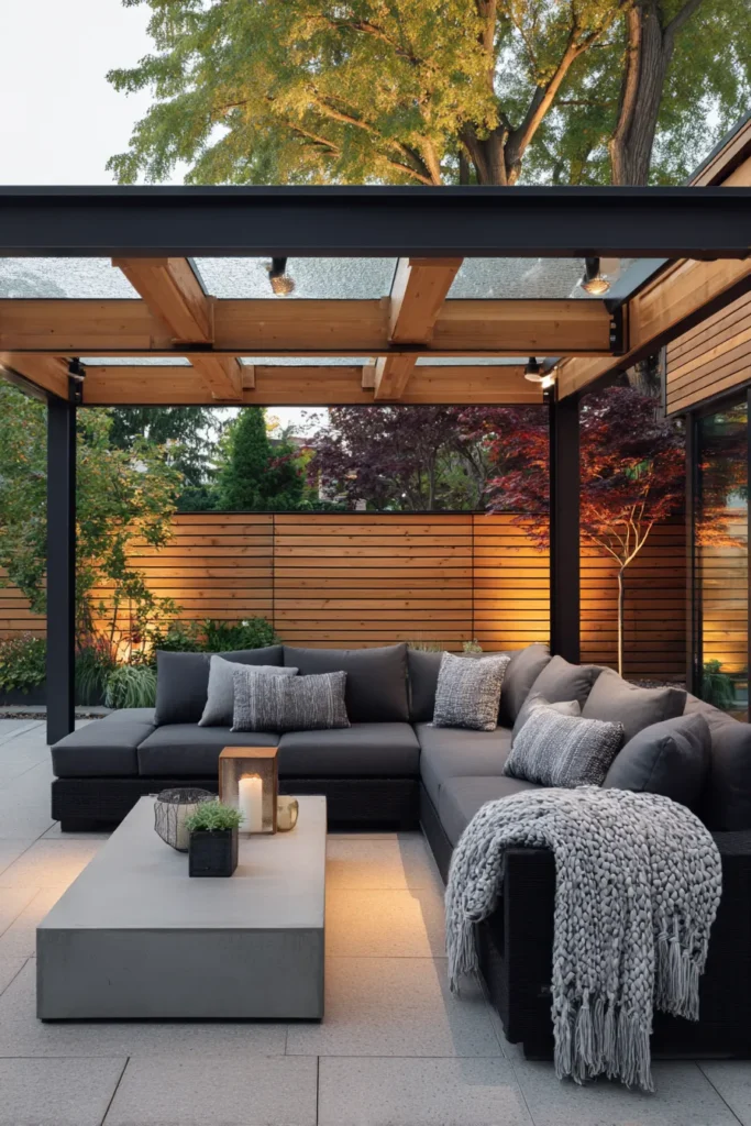 Black posts and natural beams support textured glass panels that shield the weather while keeping the light. A deep charcoal sectional fills the corner with tonal pillows and a chunky knit throw. A low concrete table holds candles and a small plant. Horizontal wood fencing and garden lighting create a private glow around the patio.