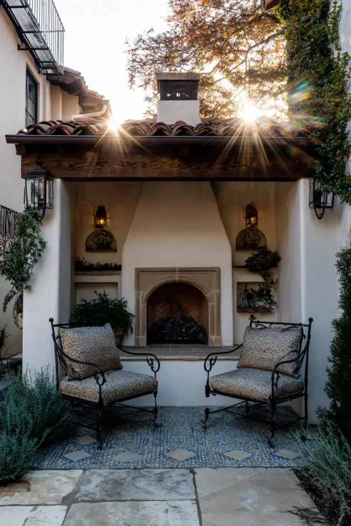 A petite covered niche feels classic with white stucco and a clay tile roof. An arched fireplace anchors the wall with stone trim. Iron lanterns and built in alcoves add charm. Patterned mosaic tiles brighten the floor. Two cushioned chairs invite quiet chats beside potted herbs and climbing vines.