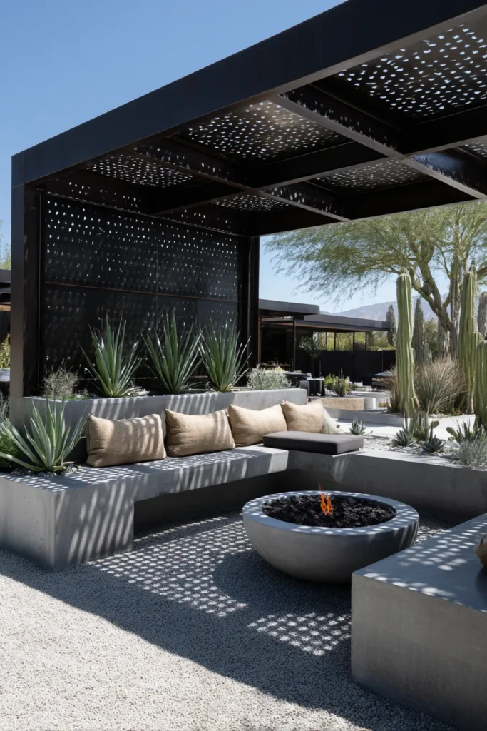 Dark perforated panels cast a lace of shifting shadows across the seating. A concrete bench wraps the corner with natural pillows and a slim backrest. A round fire bowl sits on pale gravel. Agave and cactus create sculptural borders that thrive in the heat. The scene feels architectural and low fuss.