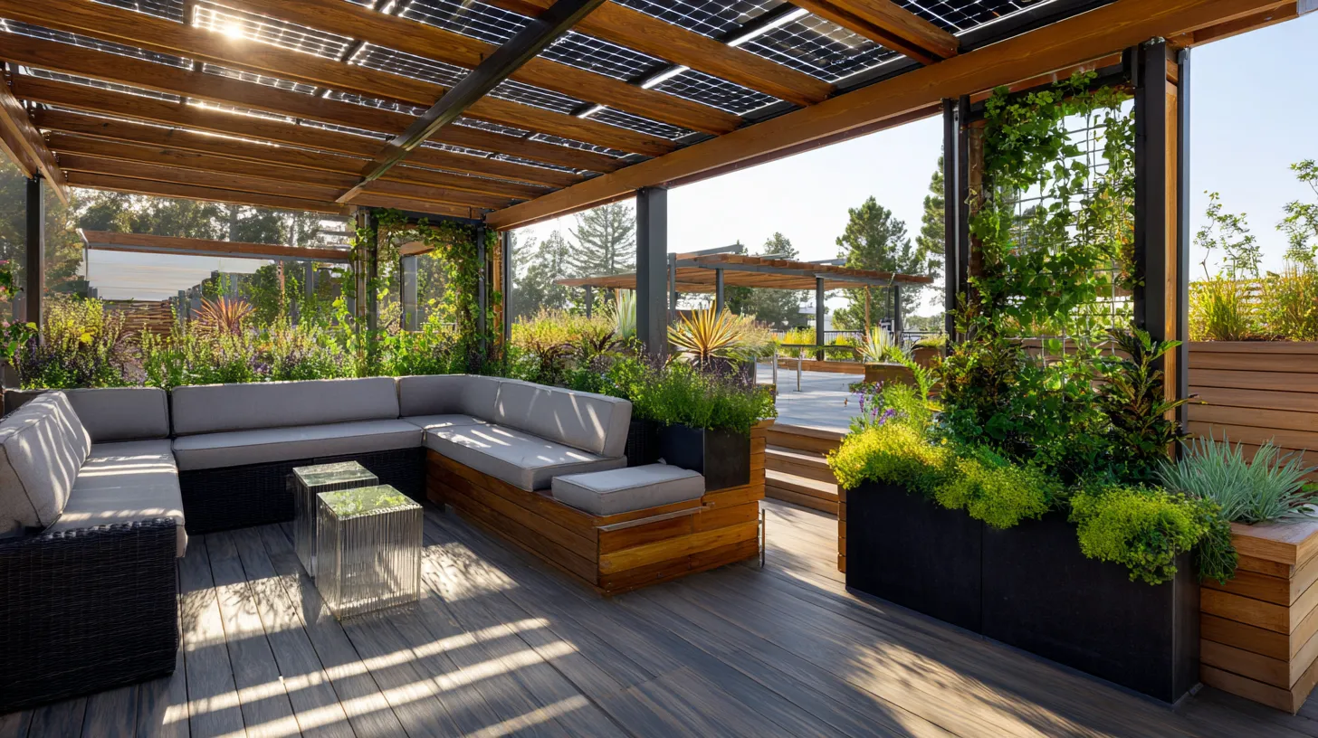 A slim black frame holds slatted shade that tucks in a sleek LED line for soft night light. A built in bench with stone tone cushions wraps a petite dining table. Planter boxes overflow with grasses and herbs that sway in the evening breeze. Wood tiles warm the floor and the skyline becomes the backdrop. Everything feels tailored and tidy.