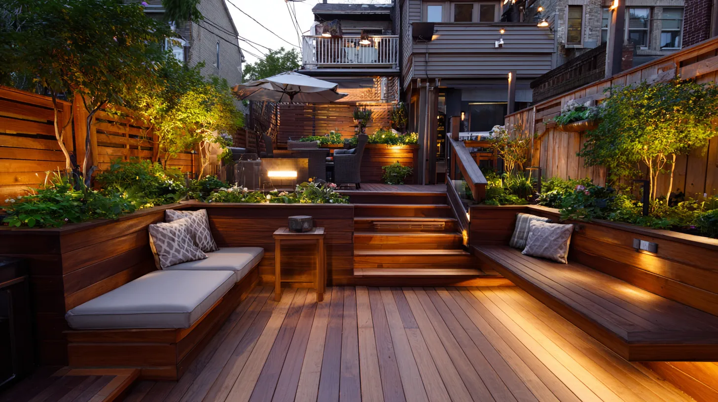 This back deck transforms a compact space into a lush green retreat with built in seating and dense planting. Warm lighting is tucked into the wood features, making the space glow at night. The mix of wood and greenery creates a cozy cocoon effect even in an urban setting.