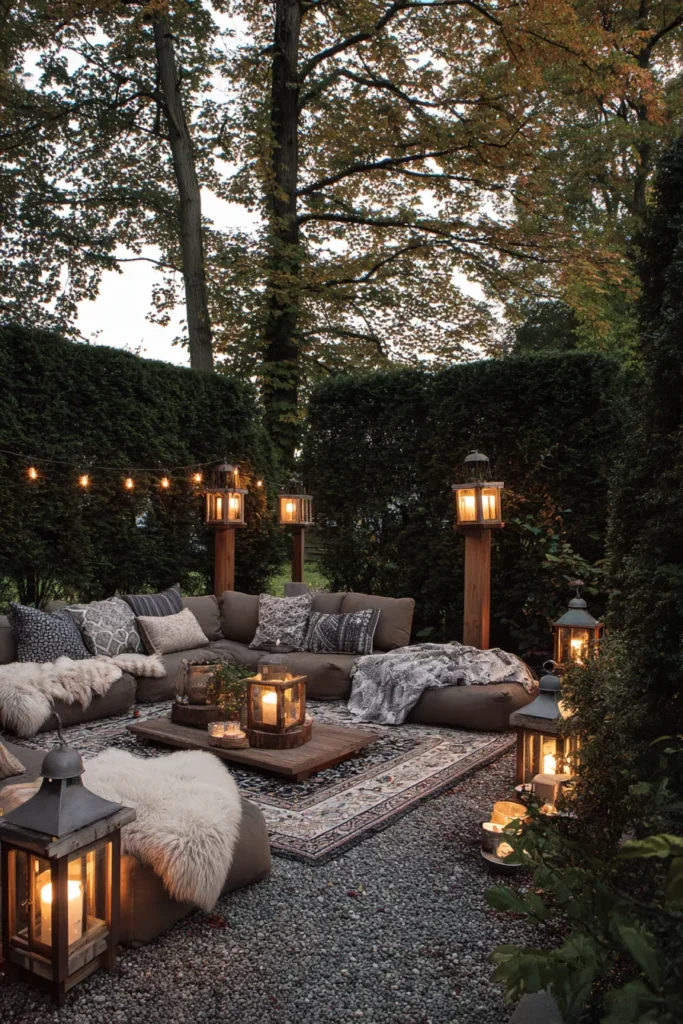 This patio truly feels like an enchanted forest getaway with its sunken, low-profile modular sofa nestled deeply into the dense greenery of the surrounding hedge. The color palette is so grounding, using muted earth tones like deep olive, charcoal grey, and various shades of beige and cream across the plush cushions and layered rugs. The magic really happens with the lighting: a delightful mix of string lights twinkling overhead, oversized wooden pillar lanterns, and scattered metal floor lanterns creates an intimate, warm glow that makes the space irresistible after dusk.