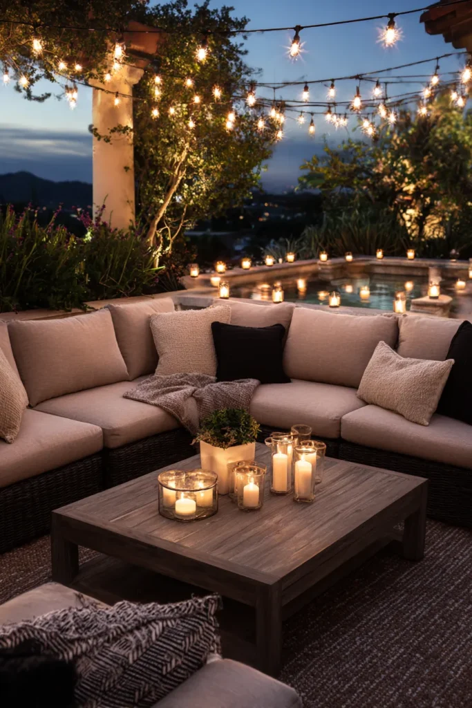 This breathtaking patio creates a stunning, luxurious evening retreat that perfectly frames a gorgeous view. The enormous, low-slung sectional is covered in chic, neutral taupe cushions, providing ample seating for guests. The look is kept sophisticated with a few contrasting black pillows and various textured knits, but the real star is the lighting. Hundreds of twinkling string lights are draped overhead like a canopy, and dozens of glowing candles are scattered across the coffee table and around the perimeter of the pool, creating pure magic.
