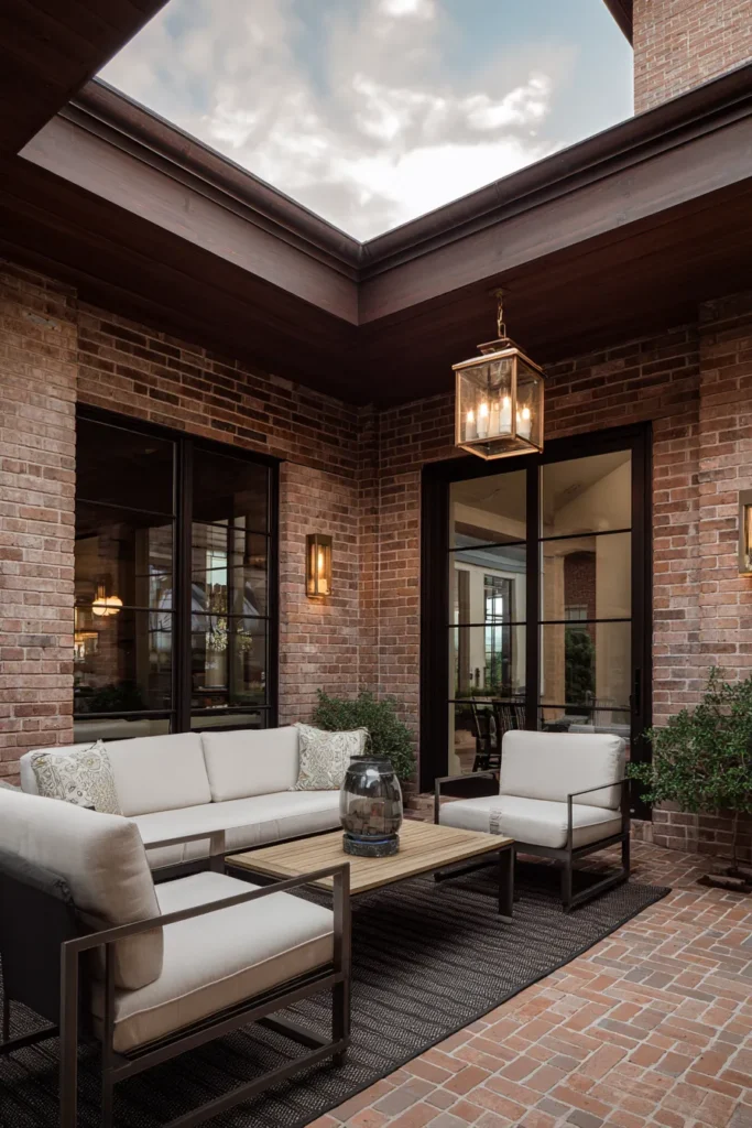 This design features a chic and sophisticated courtyard living room nestled within a beautiful, traditional red brick setting. The space is anchored by an open-air ceiling framed with rich, dark wood trim, creating a stunning architectural detail. The furniture is decidedly modern, with crisp white cushions set in sleek metal frames, all grounded by a dark, textured outdoor rug. The lighting is classic and elegant, featuring a stunning brass lantern chandelier and matching wall sconces that warm up the exposed brick perfectly.
