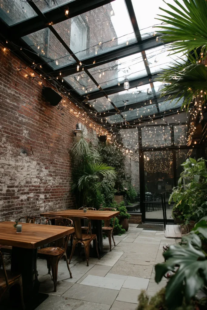This stunning space transforms a compact urban area into a mesmerizing greenhouse dinner nook with a cool, industrial edge. The key feature is the glass ceiling and back wall, which turn the patio into an enclosed, light-filled sanctuary, perfect for enjoying the outdoors rain or shine. The exposed red brick walls add raw character, beautifully contrasting with the lush, tropical potted plants that create a hidden garden feel. Simple wooden tables paired with antique-style metal chairs keep the focus on the dramatic lighting from the strands of twinkling Edison bulbs draped across the glass roof.