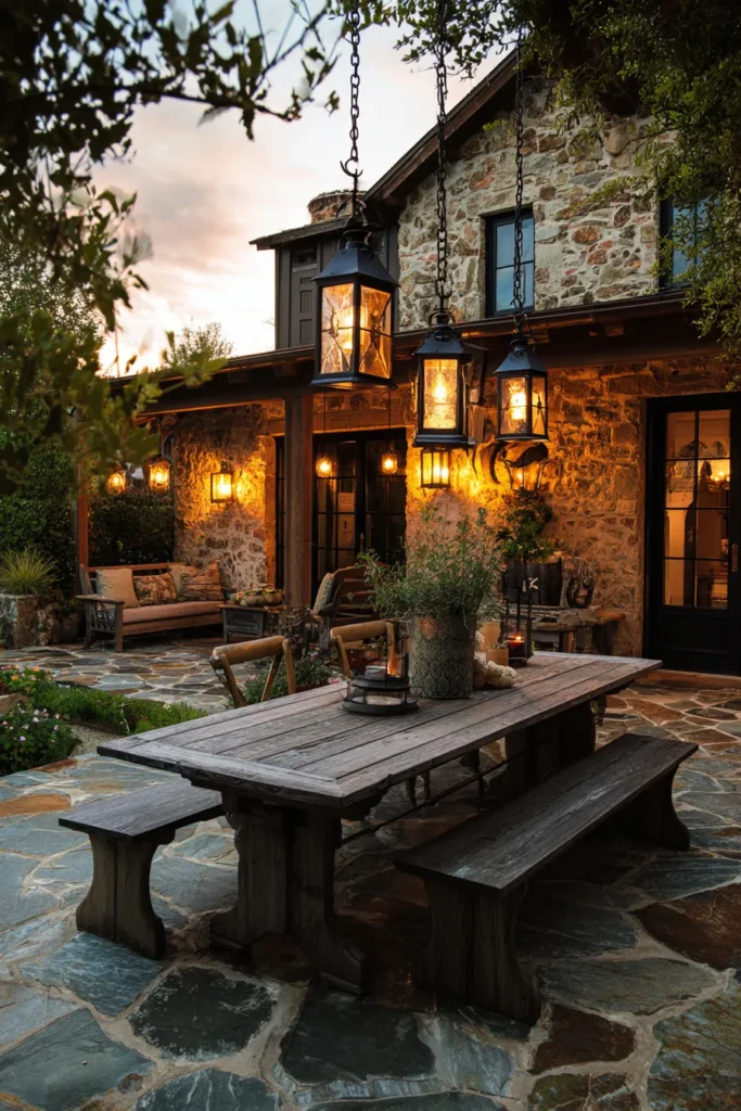 This incredibly charming patio creates a dreamy rustic dining experience that feels straight out of a European countryside retreat. The space is defined by the gorgeous natural stone facade of the house and a rugged flagstone patio floor. A heavy, distressed wooden dining table with matching benches sits at the center, inviting long, cozy meals. The incredible focal point is the collection of oversized black lanterns suspended by heavy chains, which cast an unbelievably warm, romantic glow over the entire area at twilight.