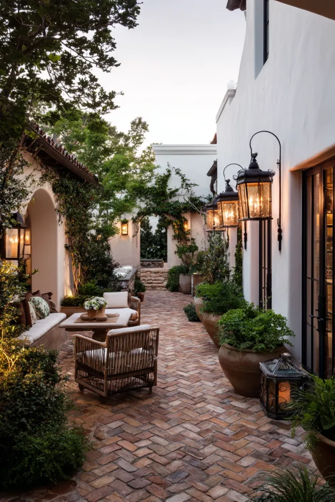 I am head-over-heels for the way this patio balances the warmth of the terra-cotta brick with the cool, clean white of the walls—it’s pure architectural drama! The feeling of walking through that archway draped in greenery is just so magical, and the way those huge lanterns light up the path makes the whole area feel like a hidden, romantic secret. It’s truly a masterclass in using light and texture to create a welcoming, soulful space.