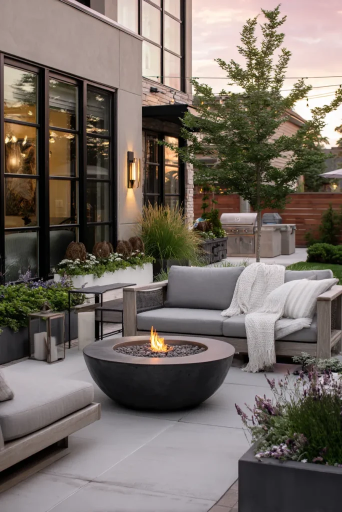 What I love most about this design is how perfectly it combines modern lines with ultimate comfort—it’s so stylish but still completely cozy! That beautiful oversized fire pit instantly becomes the gathering spot, making it irresistible on a cool evening. Plus, the bright white knit throw draped over the sofa is such a simple touch, but it really makes the entire space look inviting and ready for a relaxing night in.