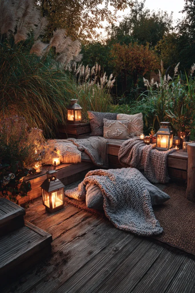 This beautiful patio is the definition of hygge comfort, focusing on a low-to-the-ground, floor-lounge style that feels wonderfully enveloping. The space features simple built-in bench seating tucked among tall grasses and decorative plumes, which creates a natural, secluded barrier. The true coziness comes from the generous layering of chunky knit blankets, patterned pillows, and floor cushions in muted grays and beiges. The surrounding oversized metal lanterns and flickering candles cast a rich, warm light that makes the simple wooden deck planks glow.