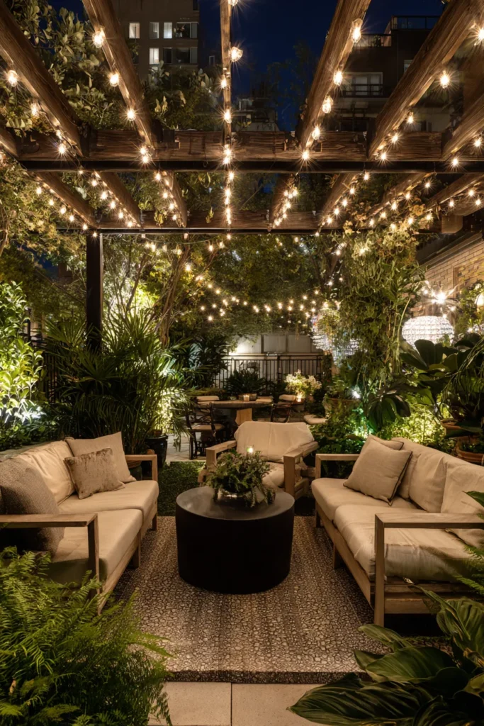 This city patio transforms a typical backyard into a luxurious tropical urban oasis with an incredible focus on lush greenery and dramatic lighting. The space is anchored by a dark wooden pergola covered in leafy vines, from which strands of globe string lights are suspended like a glittering ceiling. The seating area is defined by two simple, chic light-colored sofas set on a patterned outdoor rug, creating a beautiful contrast with the dark woven coffee table and the dense, vibrant foliage surrounding the entire area.