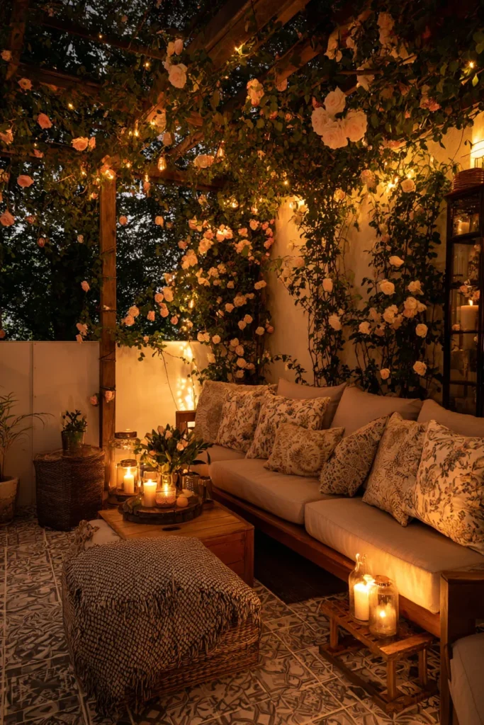 This gorgeous space feels like a secret garden escape, completely surrounded by a towering display of flowering pink roses that climb over the pergola and walls. The seating area features a simple, modern wooden sofa with plump neutral cushions, but the look is all about the layers of romantic florals—both real and printed. The patterned pillows, the woven storage ottoman, and the scattered lanterns and pillar candles all create a stunning, atmospheric glow that is just unbelievably intimate.