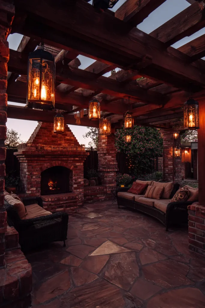 This stunning patio is built for old-world romance and warmth, creating a totally enclosed outdoor room with incredible architectural detail. It features a handsome, oversized red brick fireplace as its main focal point, which anchors the entire space. The floor is laid with rugged flagstone pavers, and a rich, dark wood pergola covers the ceiling. The seating consists of comfortable dark wicker furniture topped with plump neutral cushions, while multiple hanging metal lanterns with golden light cast a magical, flickering glow over the whole lounge area.