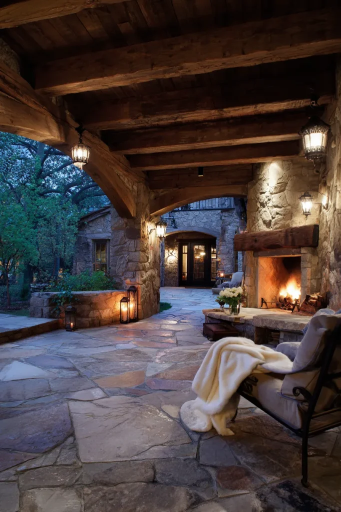 I am absolutely captivated by the stunning textures here—the combination of the smooth throw, the rough stone walls, and those gorgeous wooden beams is just magnificent! It feels so sturdy, yet the soft candlelight and the roar of the fire make it incredibly welcoming and soothing. This is the kind of patio that makes you feel instantly protected and relaxed, and I think the way the architecture frames the beautiful view beyond the hearth is just breathtaking.