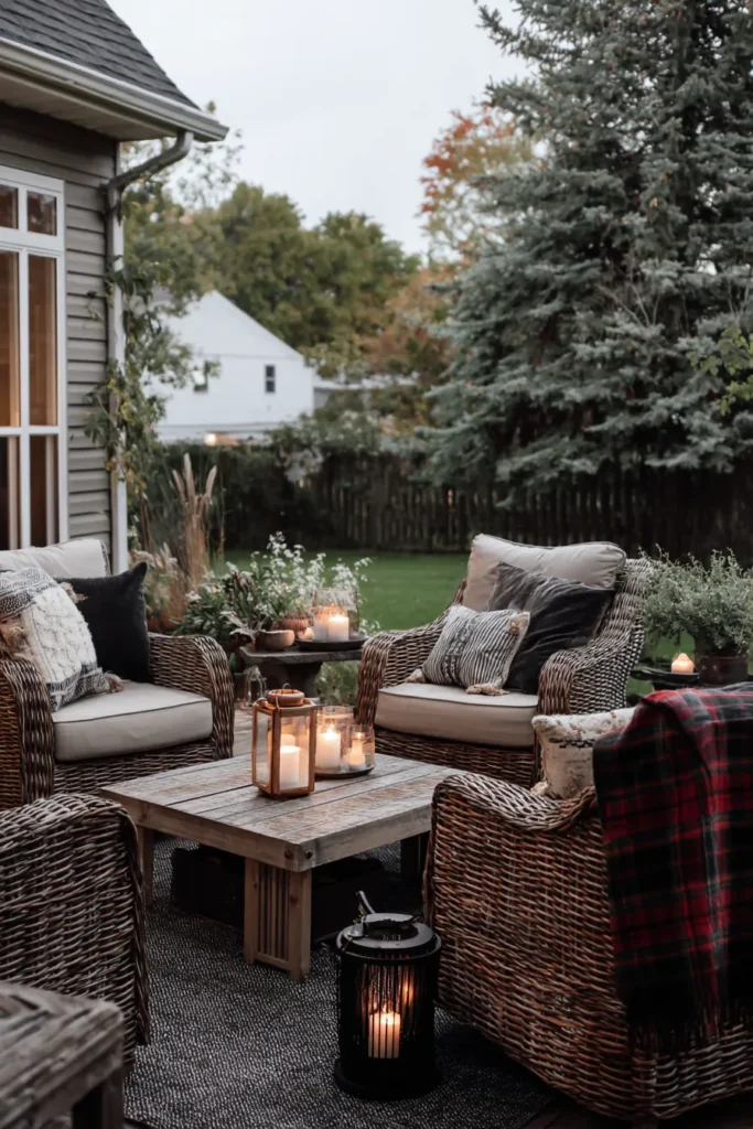 I think the best part about this little grouping is how perfectly those plaid and knit patterns transition the space into autumn—it feels like the ultimate spot for Thanksgiving weekend! The sturdy wicker and the rustic wood give it such a grounded, charming feel, and the fact that you can wrap up in that cozy blanket and just watch the light fade is simply wonderful. It’s a flawless example of making an outdoor area feel like a true extension of your home.