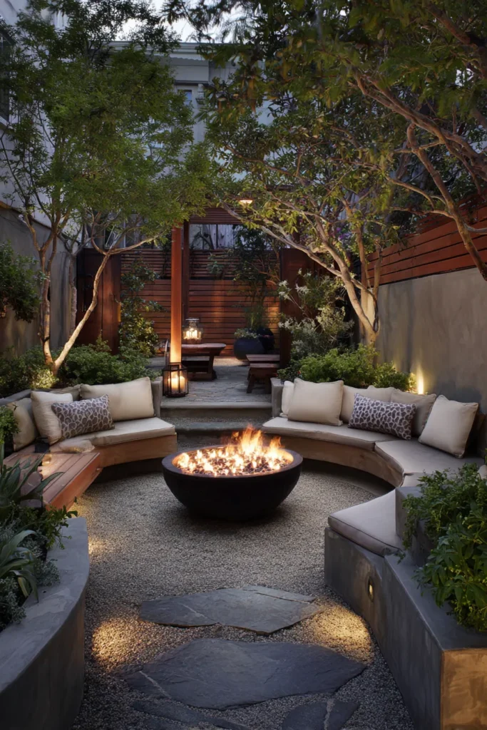 I am obsessed with the architectural elegance of this space—the way the curved, built-in benches hug the fire pit is just perfect for intimate gatherings! It feels so sophisticated and serene, like a little hidden oasis tucked away from the world. The combination of the smooth concrete walls and the soft greenery shows that even a small patio can feel incredibly luxurious and welcoming, especially when the fire is blazing.