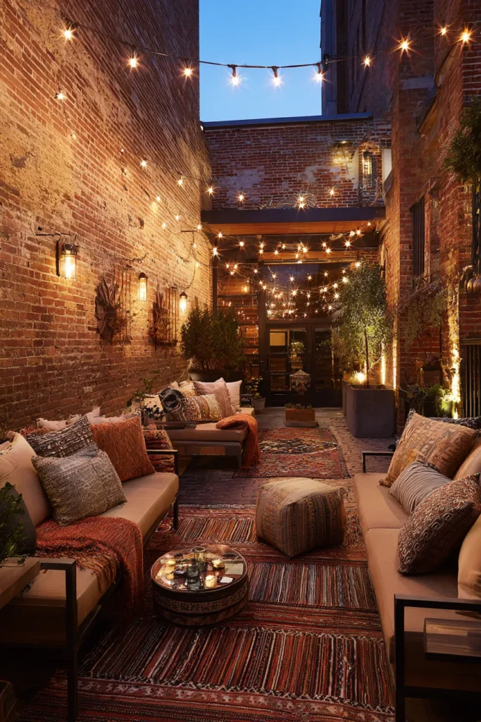 I am head-over-heels for the dramatic lighting in this alleyway—the sheer number of twinkling bulbs against that rough brick is just breathtakingly beautiful! The incredible use of pattern and color with all those layered rugs and cushions makes the whole space feel so rich and soulful, like a stylish, hidden gem only you know about. It truly feels like an immersive, magical experience that transforms a basic area into a cozy, unforgettable lounge.