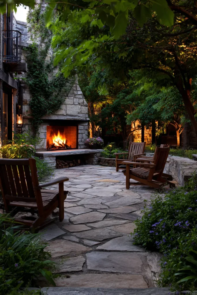 This stunning patio creates a truly epic, timeless gathering space with a breathtaking stone fireplace at its heart. The towering fieldstone fireplace with its huge hearth makes an immediate statement, surrounded by a natural flagstone patio floor. Simple, comfortable wooden Adirondack-style chairs are perfectly placed to take in the warmth and light of the crackling fire, while the surrounding mature trees and lush vines creeping up the stone work create a secluded, peaceful setting.