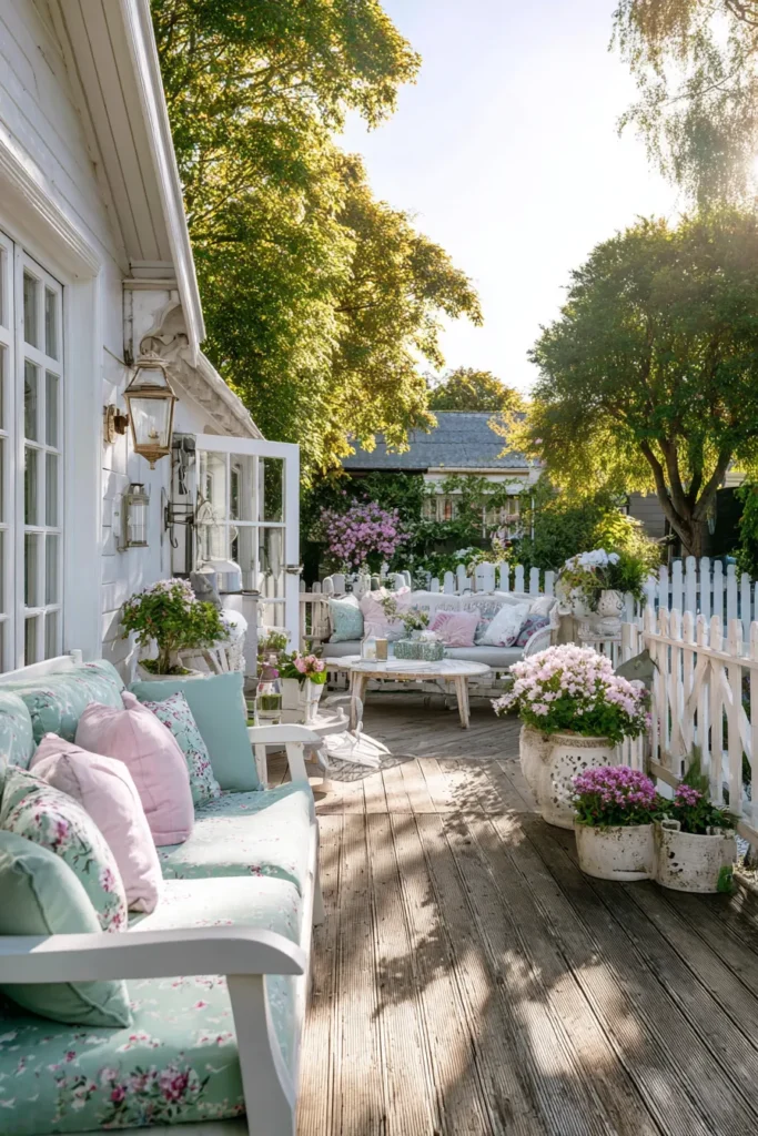 I can’t get over how airy and feminine this patio feels—it’s like stepping into a beautiful storybook! The way the sunshine streams over the white plank floor and highlights those sweet, faded floral prints on the daybed makes my heart flutter. It’s a space that feels instantly welcoming and utterly relaxed, making it the perfect spot for afternoon tea or just soaking up the quiet, peaceful charm of a summer day.