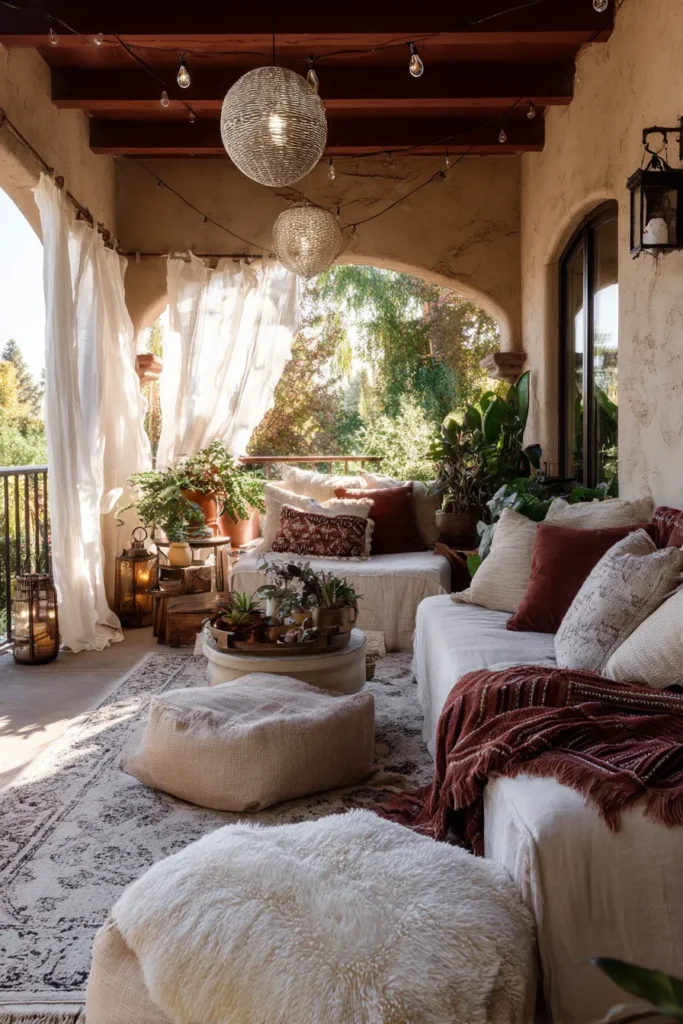 This covered patio is a dreamy Bohemian haven with its distinct Southwestern and Mediterranean influences, featuring thick, textured stucco walls and gracefully arched openings. The seating is all about low-to-the-ground comfort, with white slipcovered sofas and large, shaggy faux fur poufs that invite serious lounging. Sheer white curtains are used to soften the light and add privacy, while the rich, earthy accents of terracotta pillows and a burgundy knit throw provide a lovely pop of saturated color against the neutral backdrop.