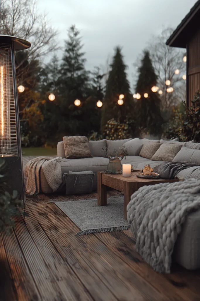 This beautiful deck is designed for ultimate year-round coziness, with a focus on textures that make you want to snuggle up, even on a chilly evening. The huge sectional sofa is covered in a soft, heather gray fabric and is absolutely loaded with chunky knit throws and various textured pillows in natural tones. The space is anchored by a simple, rustic wooden coffee table and a plush gray rug, while the warmth comes from an eye-catching outdoor heater and those whimsical string lights glowing softly in the background.
